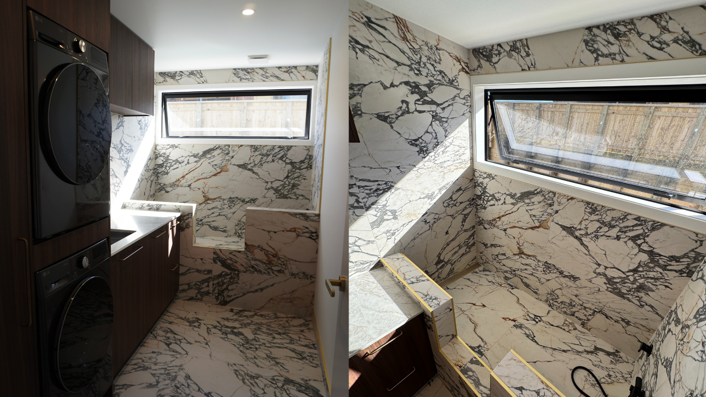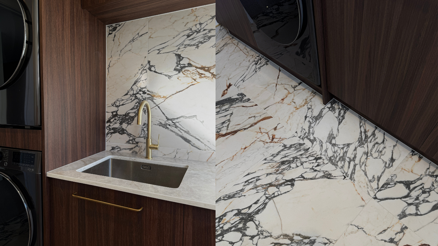 Laundry: This is where I went a little rogue. I chose a Calacatta marble-look tile to add drama and impact. It instantly elevates the space, and our custom dog bath has become a real talking point when guests visit.