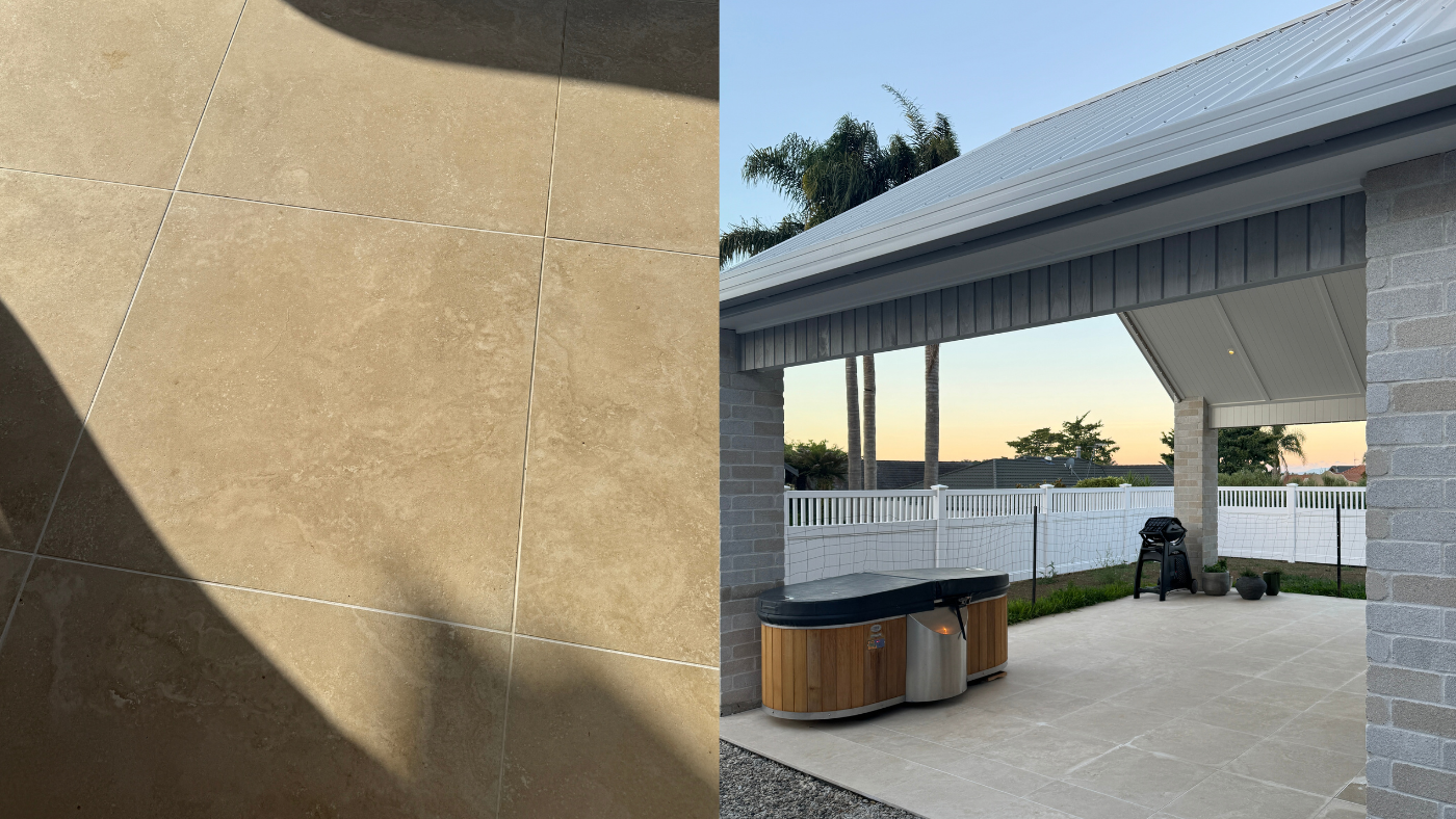 Outdoor patio: We used Classic Crosscut Off White Grip tiles, which echo the travertine-look tiles inside. This helps visually connect the indoor and outdoor spaces while providing durability and slip resistance.