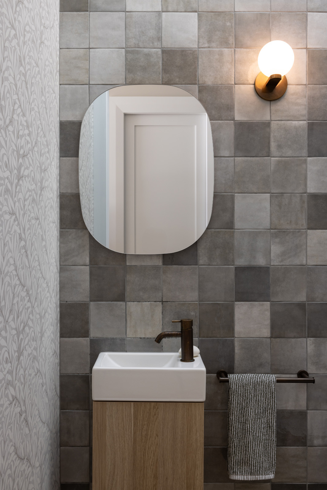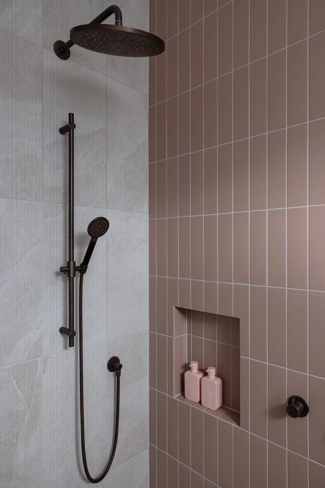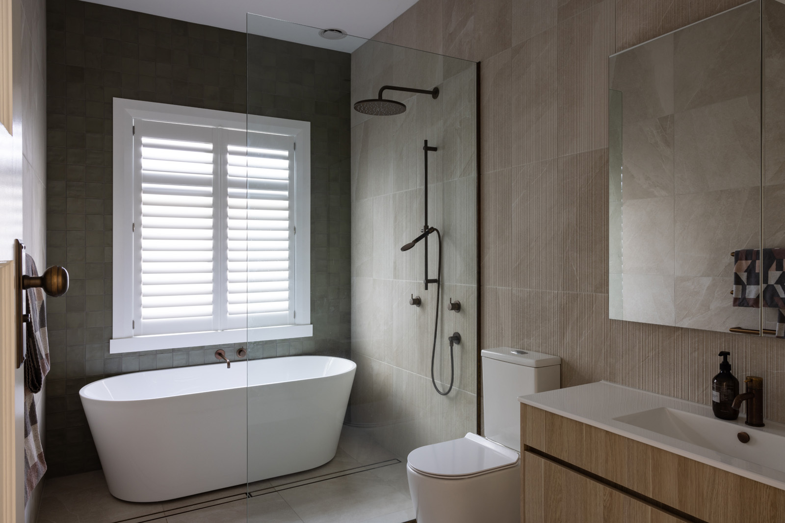 In the master ensuite, a strong coloured tile creates a moody, romantic atmosphere, setting it apart from the main bathroom. This thoughtful contrast adds visual interest while still tying into the overall design palette.