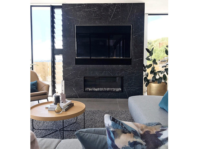 A stunning statement fireplace designed by Mint Six Interiors. This Italian black marble look tile is the perfect choice for modern living, offering a feature that's contemporary as well as timeless.
