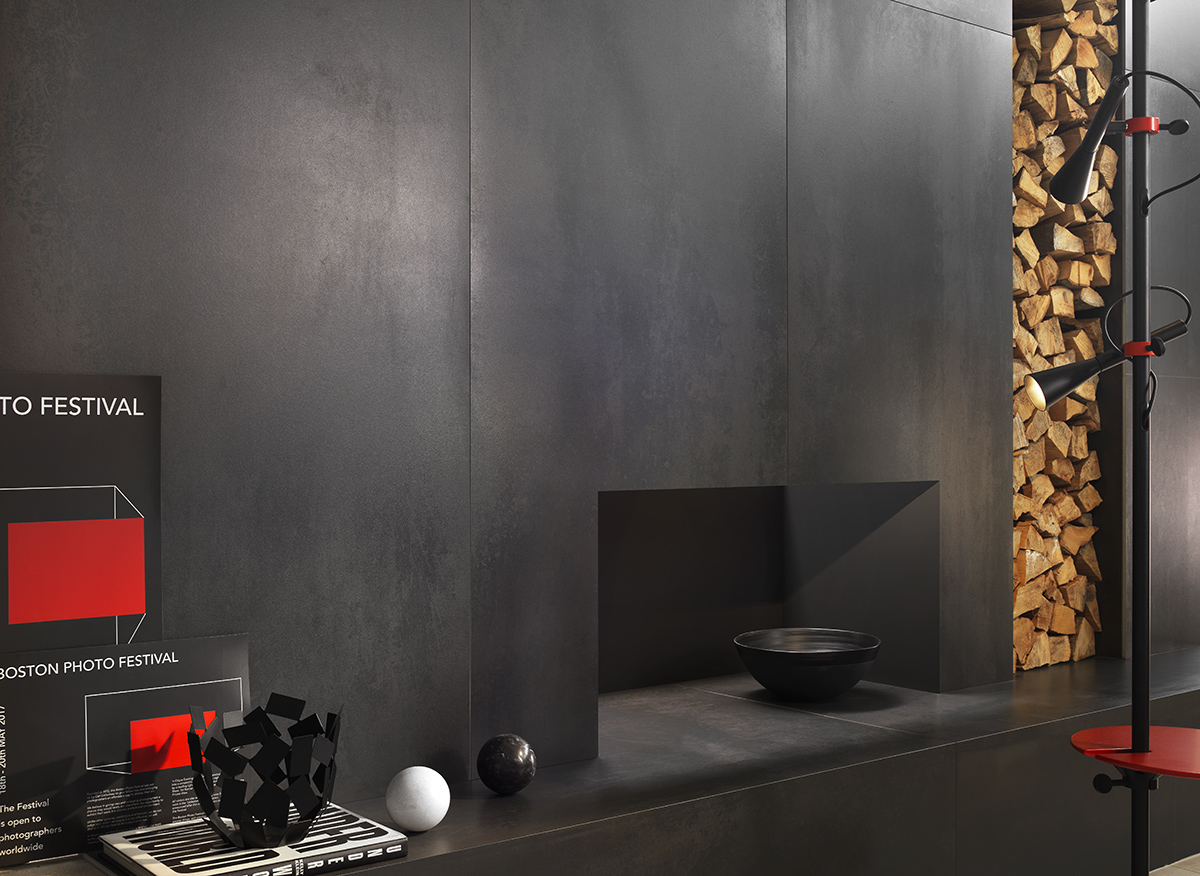 Tiling the whole wall is great way to create a focal point around the fire. Tile used: Cementia Grey